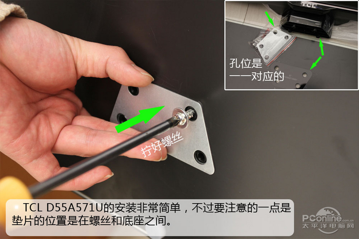 底座的安拆对于TCL D55A571U来说能够说常简单的了,只需将玻璃材质的底座上预留的孔往电视机一套,接着垫上配件中的金属片,这比一些采用各类暗扣的电视实正在便利太多了。