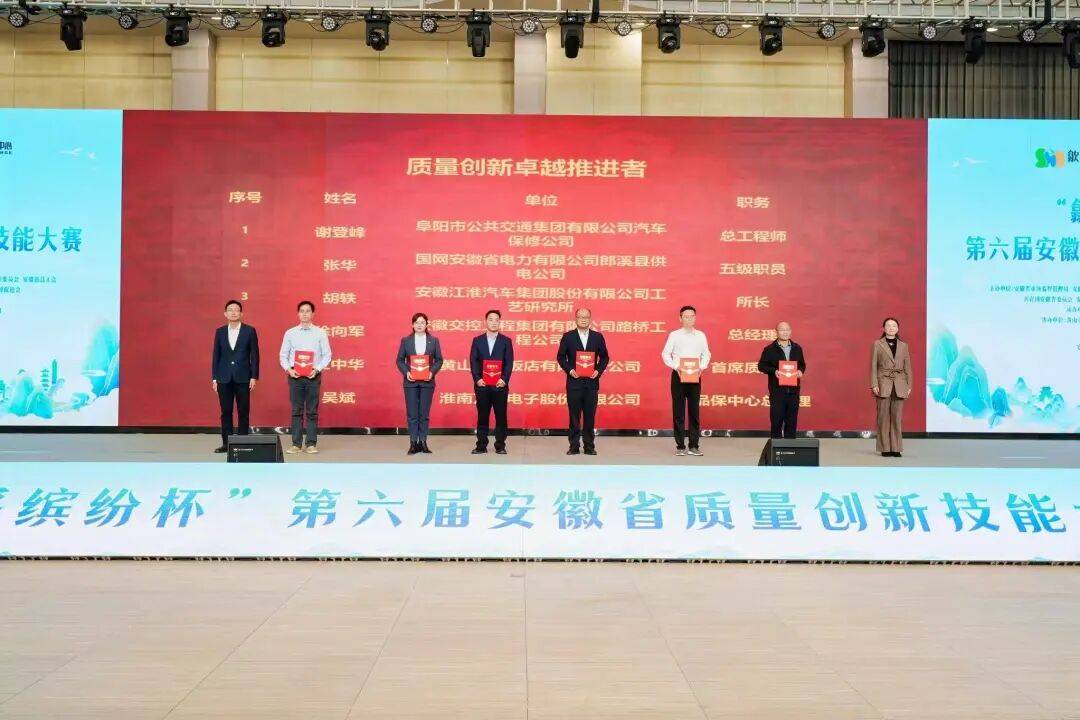 阜阳市公共交通集团无限公司汽车保修公司总工程师谢登峰、国网安徽省电力无限公司郎溪县供电公司五级人员张华、安徽江淮汽车集团股份无限公司工艺研究所所长胡轶、安徽交控工程集团无限公司桥工程公司总司理徐向军、黄山西海饭馆无限义务公司首席质量官王中华、淮南万泰电子股份无限公司品保核心总司理吴斌共6人荣获质量立异杰出推进者。