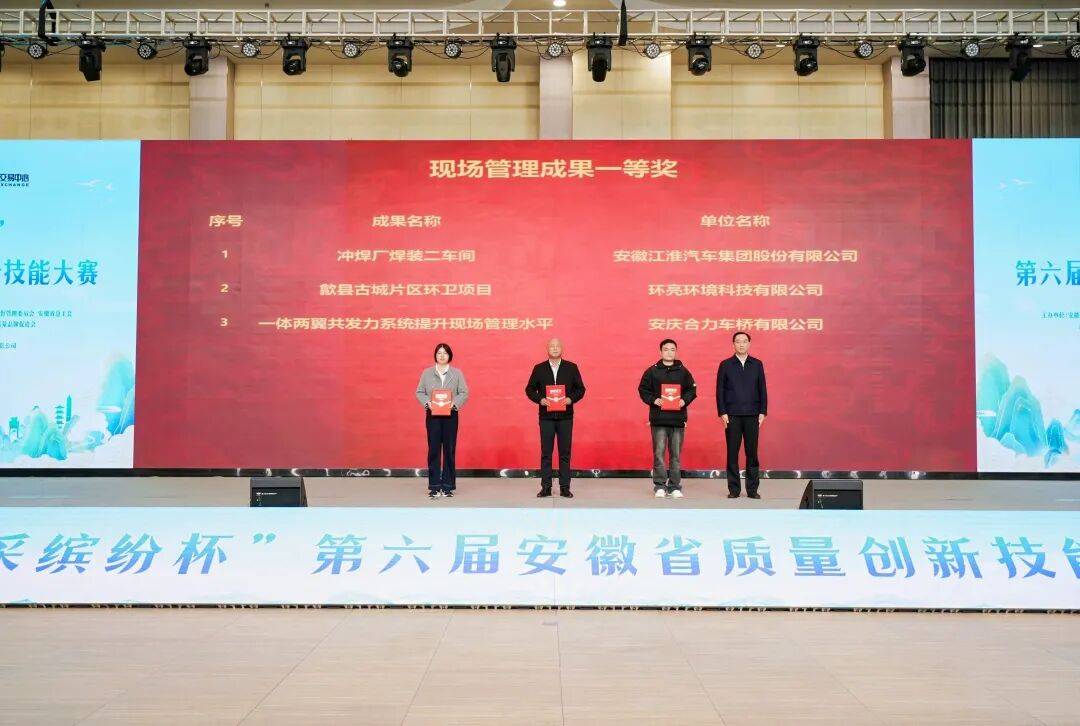 安徽江淮汽车集团股份无限公司的冲焊厂焊拆二车间、环亮科技无限公司的歙县古城片区环卫项目、安庆合力车桥无限公司一体两翼力系统提拔现场办理程度共3项荣获现场办理一等。